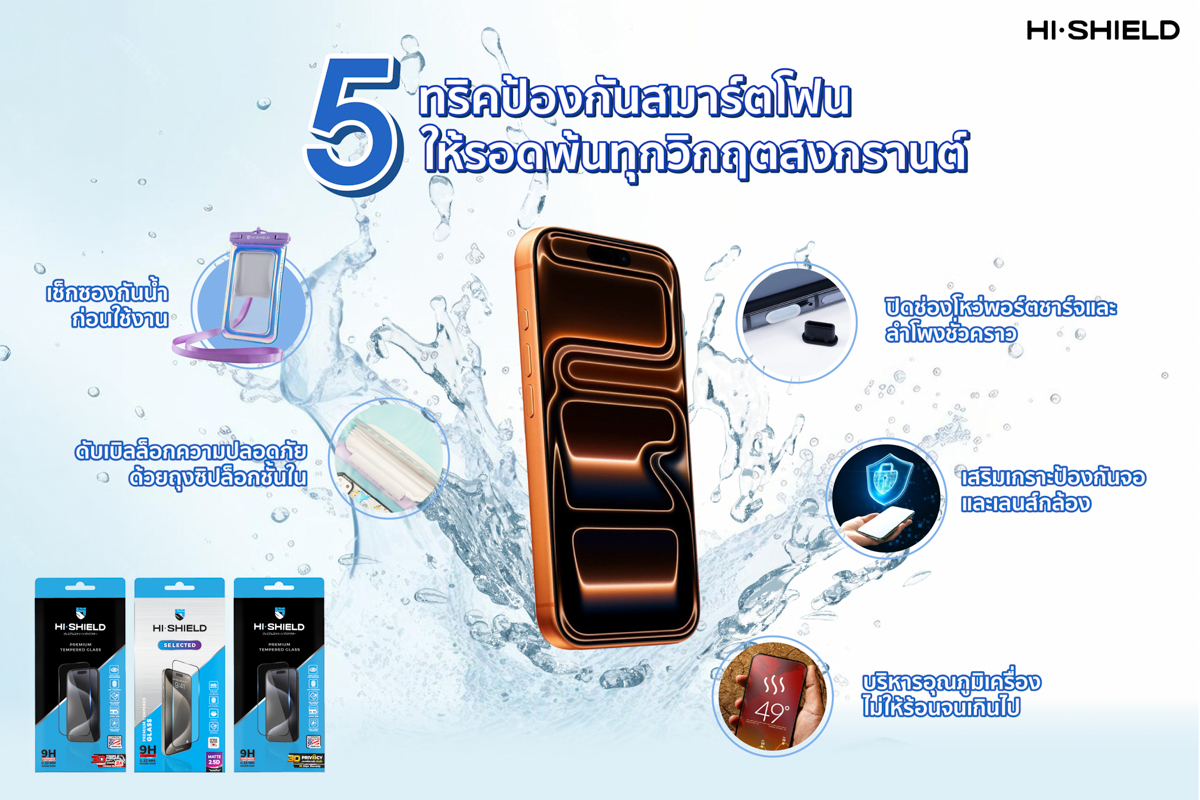 การเตรียมความพร้อมอย่างรัดกุมคือคีย์เวิร์ดสำคัญที่สายคอนเทนต์ต้องท่องจำให้ขึ้นใจ เริ่มตั้งแต่สเต็ปเบสิกอย่างการเทสซองกันน้ำก่อนใช้ เพิ่มเลเยอร์ความปลอดภัยด้วยถุงซิปล็อก ปิดผนึกพอร์ตชาร์จให้มิดชิด ไปจนถึงการคอยบริหารอุณหภูมิเครื่องไม่ให้โอเวอร์ฮีท และไฮไลต์สำคัญที่ขาดไม่ได้คือการติดอาวุธเสริมด้วยฟิล์มกระจก HI-SHIELD เพื่อเป็นปราการด่านสุดท้ายคอยรับแรงกระแทกและกันรอยขีดข่วน เพียงทำตาม 5 สเต็ปนี้ สมาร์ตโฟนคู่ใจก็พร้อมลุยทุกสมรภูมิ สาดน้ำได้สุดเหวี่ยง ถ่ายรูปทำคอนเทนต์ลงโซเชียลได้รัว ๆ แบบไม่ต้องกังวลเรื่องบิลค่าซ่อมหลังจบงาน